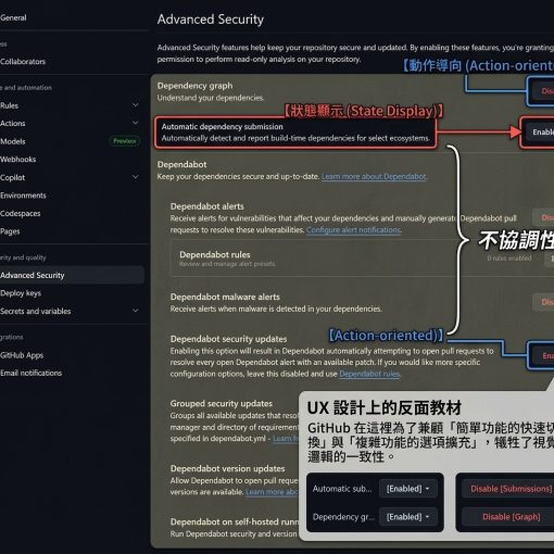 大家在用 GitHub 的安全設定頁面時,有沒有覺得腦袋卡卡的?其實這不是你的錯,是因為這個畫面同時混用了兩套完全不同的設計邏輯,讓大腦在閱讀時產生了很重的負擔。 為什麼 […]